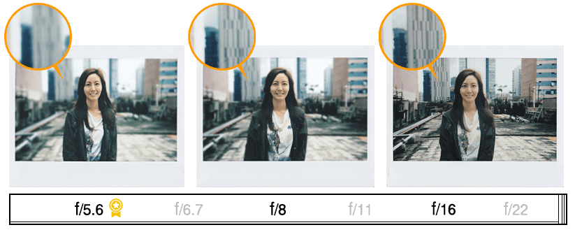 f/5.6, f/6.7, f/8, f/16, f/22의 여섯 가지 조리개 값을 선택할 수 있습니다.